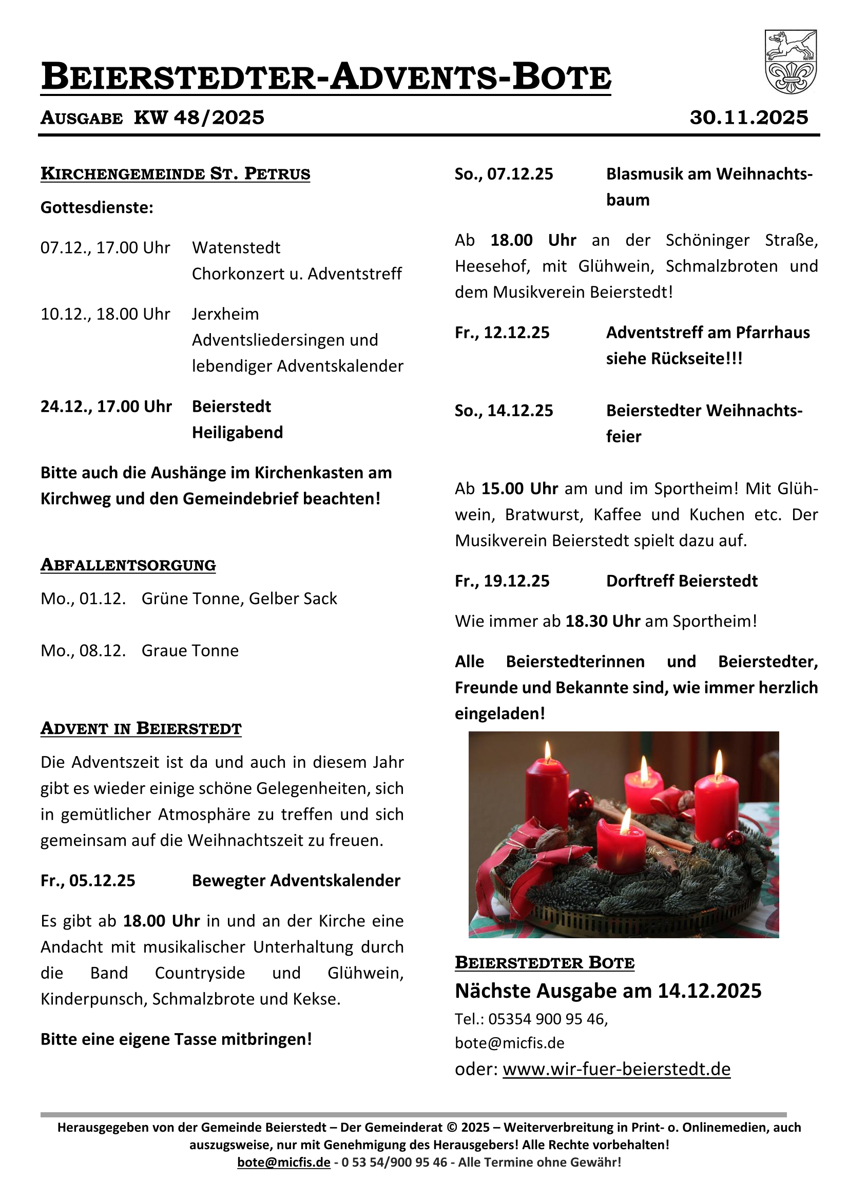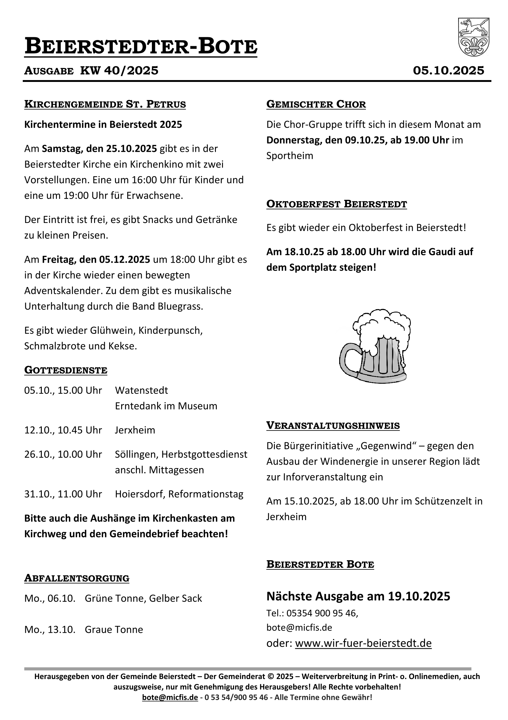 Das Mitteilungsblatt der Gemeinde Beierstedt erscheint in der Regel alle 14 Tage. In der gedruckten Version wird es an die Haushalte im Dorf verteilt und hier gibt es die Online-Version.