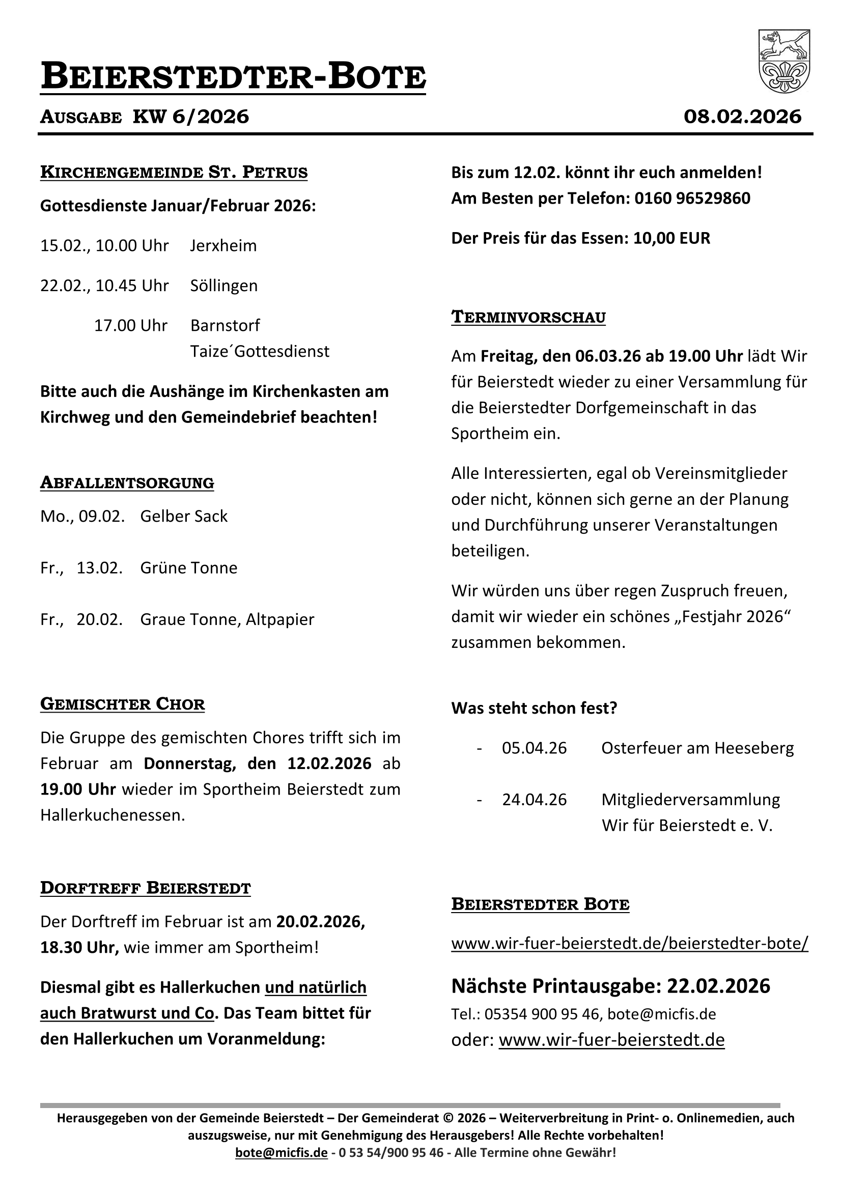 Das Mitteilungsblatt der Gemeinde Beierstedt erscheint in der Regel alle 14 Tage. In der gedruckten Version wird es an die Haushalte im Dorf verteilt und hier gibt es die Online-Version.